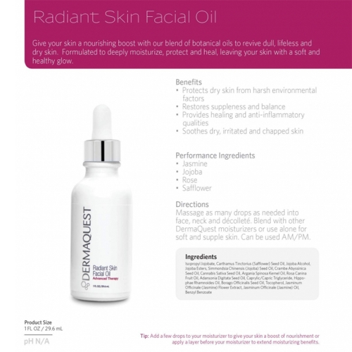 Massage as many drops as needed into face, neck and décolleté. Blend with other DermaQuest moisturizers or use alone for soft and supple skin. Can be used am and pm.